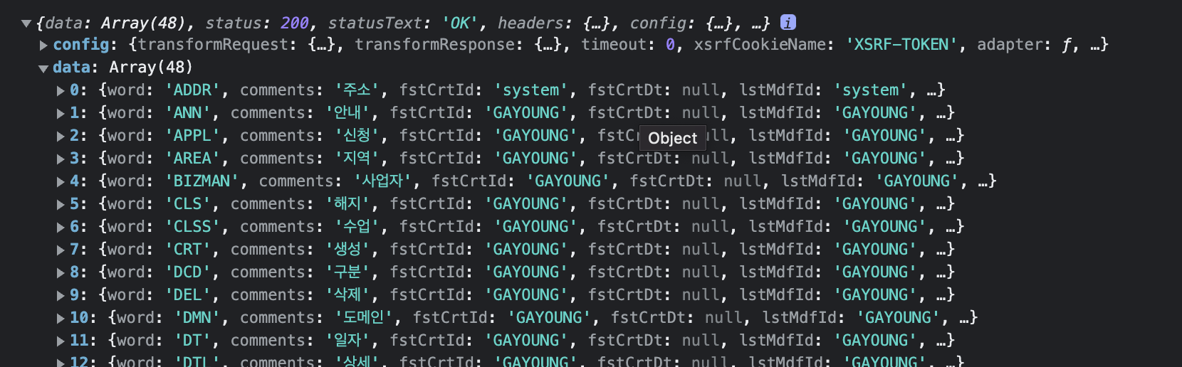 통신 완료 후 console.log로 찍은 response 값이 잘 출력되었다.