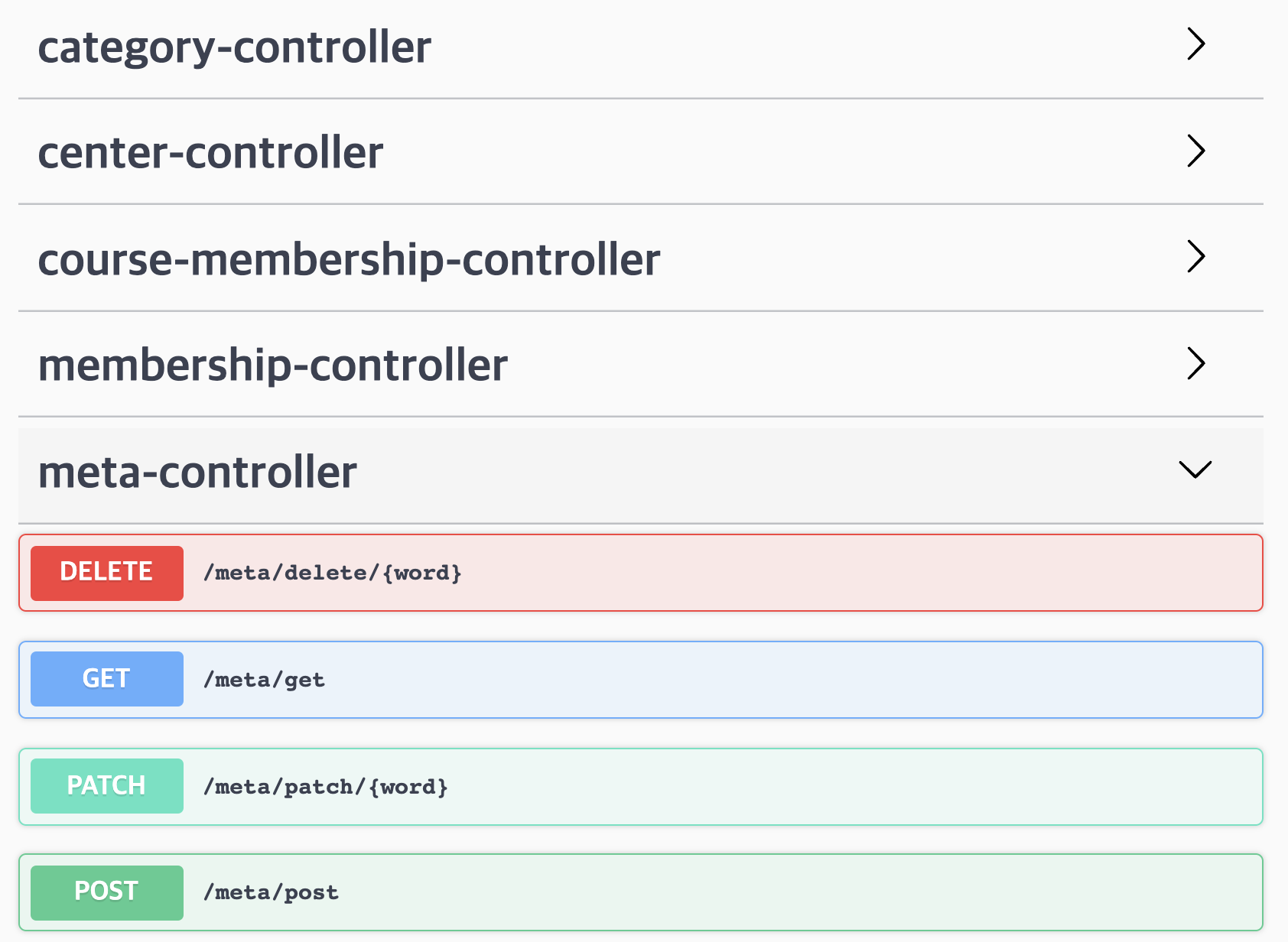 localhost:44000/swagger-ui.html에 접속하면 controller 의 리스트들이 보이고 내가 사용하고자 하는 meta-controller를 클릭해보면 , 각각의 HTML method 별 url 을 조회할 수 있다.