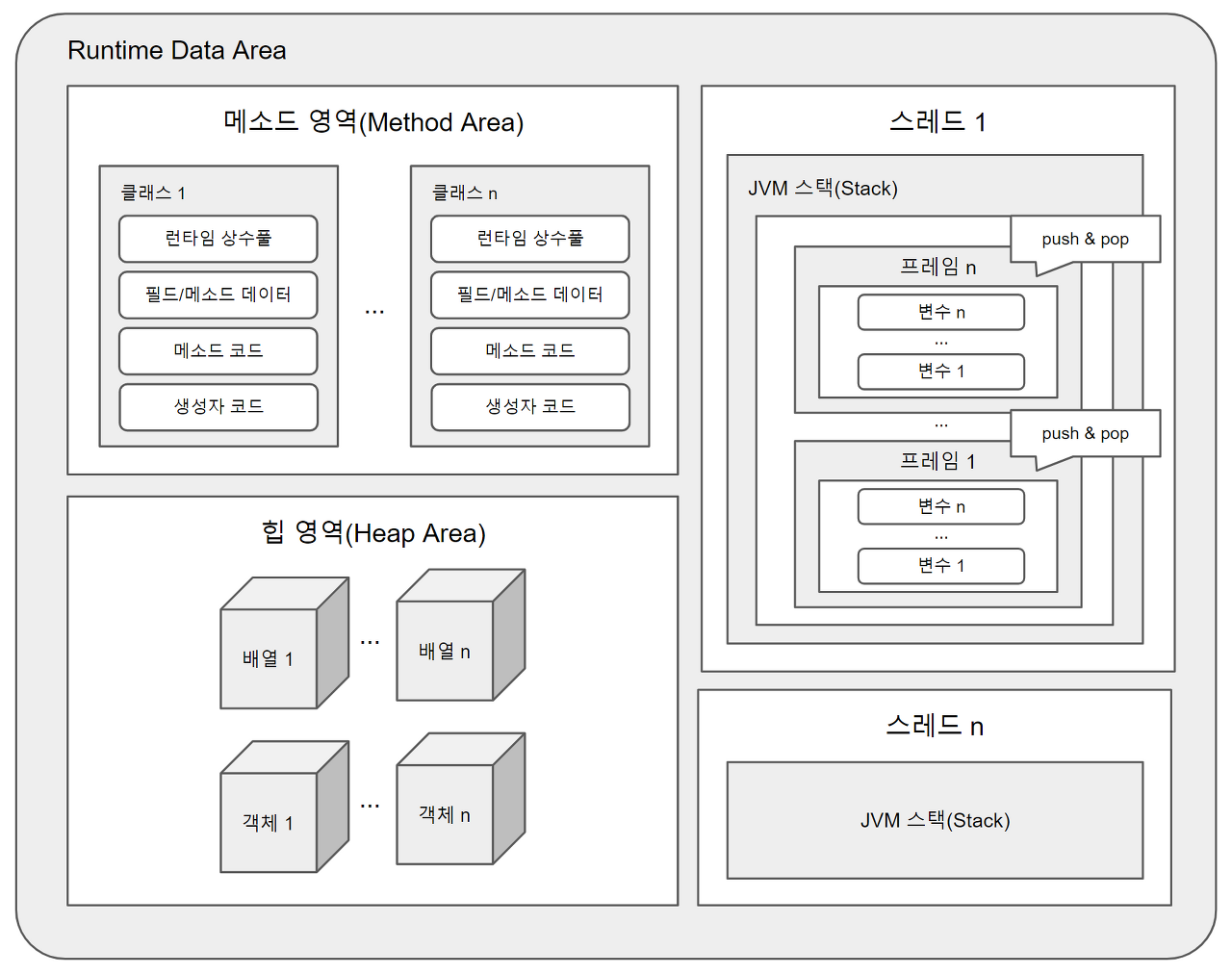 그리고 노란색으로 색칠된 Runtime Data Area는 아래와 같은 구조로 메모리를 관리한다.