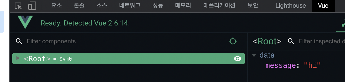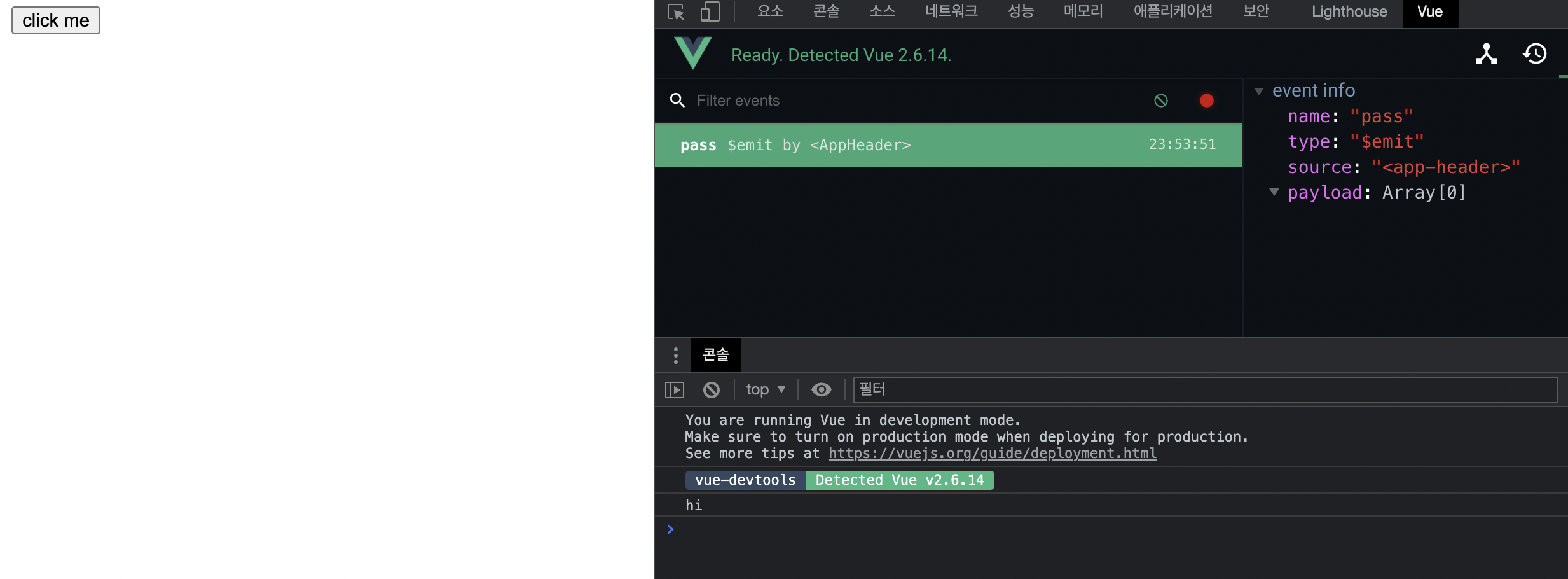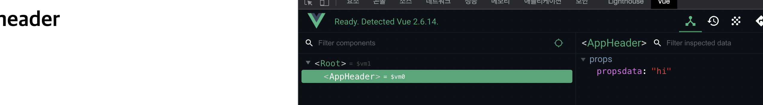 아까 선언해주었던 Root 컴포넌트의 message라는 데이터(hi)가, AppHeader 컴포넌트의 propsdata에 들어갔음을 확인할 수 있다.