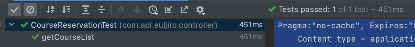 예약 시스템에서 사용자가 화면에서 수업을 예약/ 취소 할 경우 데이터를 핸들링하는 로직을 작성해보았다. 테스트 코드까지 완성시키는데 꽤 오래 걸렸다. 사용자가 예약 가능한 수업을 리스트를 조회하는 메소드를 테스트하는 로직이다. 멤버십 아이디에 대해서는 PathVariable로 받고 있기 때문에 기본 api 경로인 /reservation뒤에 1로 셋팅하고, 다른 유저아이디나 센터아이디, 기준일자에 대해서는 RequestParameter로 받고 있기 때문에 mockMvc의 Param으로 셋팅한다. @Test public void getCourseList() throws Exception{ MultiValueMap param = new LinkedMultiValueMap(); param.add("userId"..